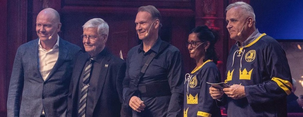 David Lindgren talks to Mats Sundin, Nicklas Lidström and Mikael Samuelsson about the Tre Kronor Legends match against NHL Alumni and Christer Plars, General Secretary of the Swedish Ice Hockey Association, presents a check for 280,055 kronor to the Borje Salming ALS Foundation.
